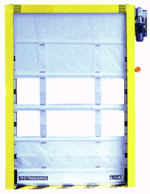 Flexible motorised interior roll-up door with opening speed of 1.2 meters per second. Standard wind resistance of 45 kph. Higher wind resistance on request. Automatically relocates it self if impact should occur. Exterior motor fixed to self-supporting frame. Standard size up to 4.5 x 4.5m. |